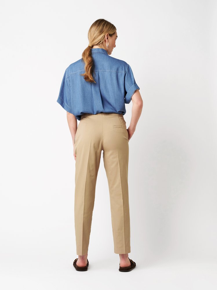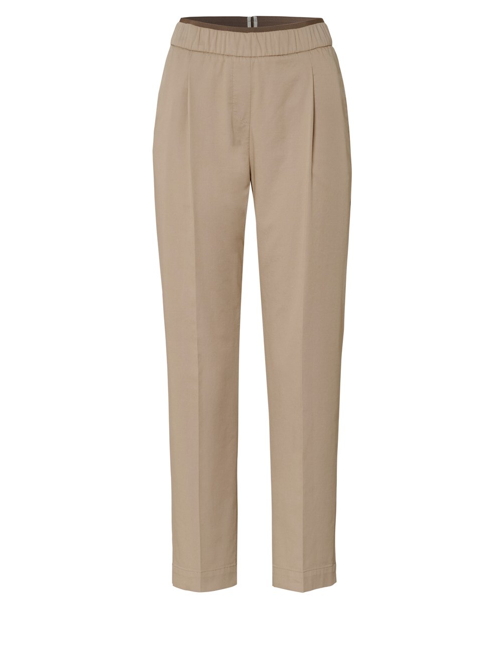 Splývavý, hladký gabardén dodává vzhledu strukturu a lehkost, zatímco elastický pas s jemným nařasením dodává decentní designový prvek. Precizně umístěné záhyby zdůrazňují delší siluetu a dělají z těchto kalhot všestranný nezbytný kousek pro elegantní každodenní vzhled.
