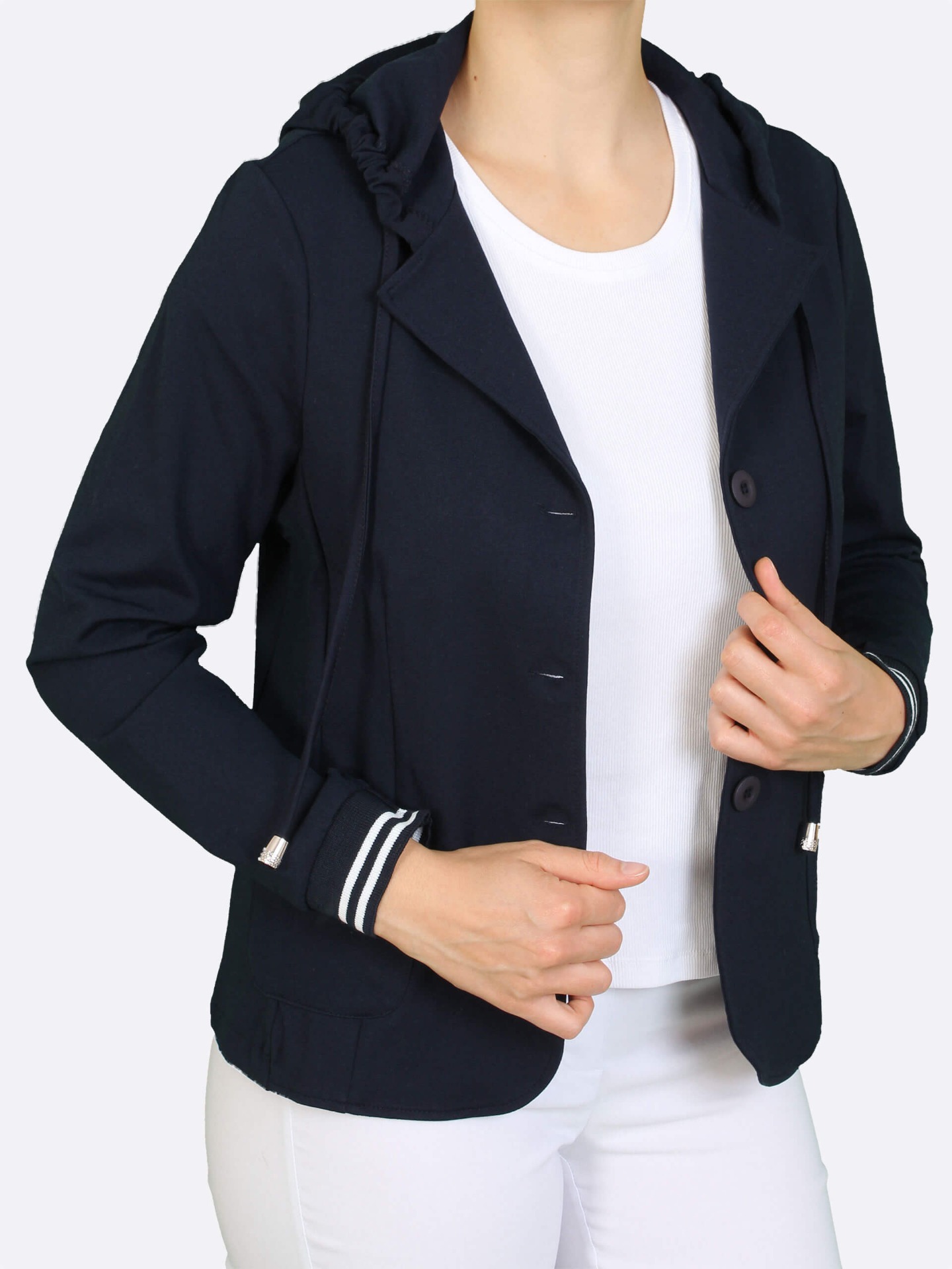 Dámské úpletové sako s kapucí – modrobílý proužek na lemu