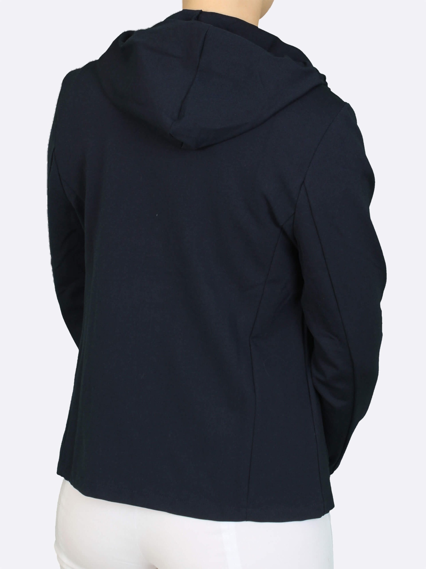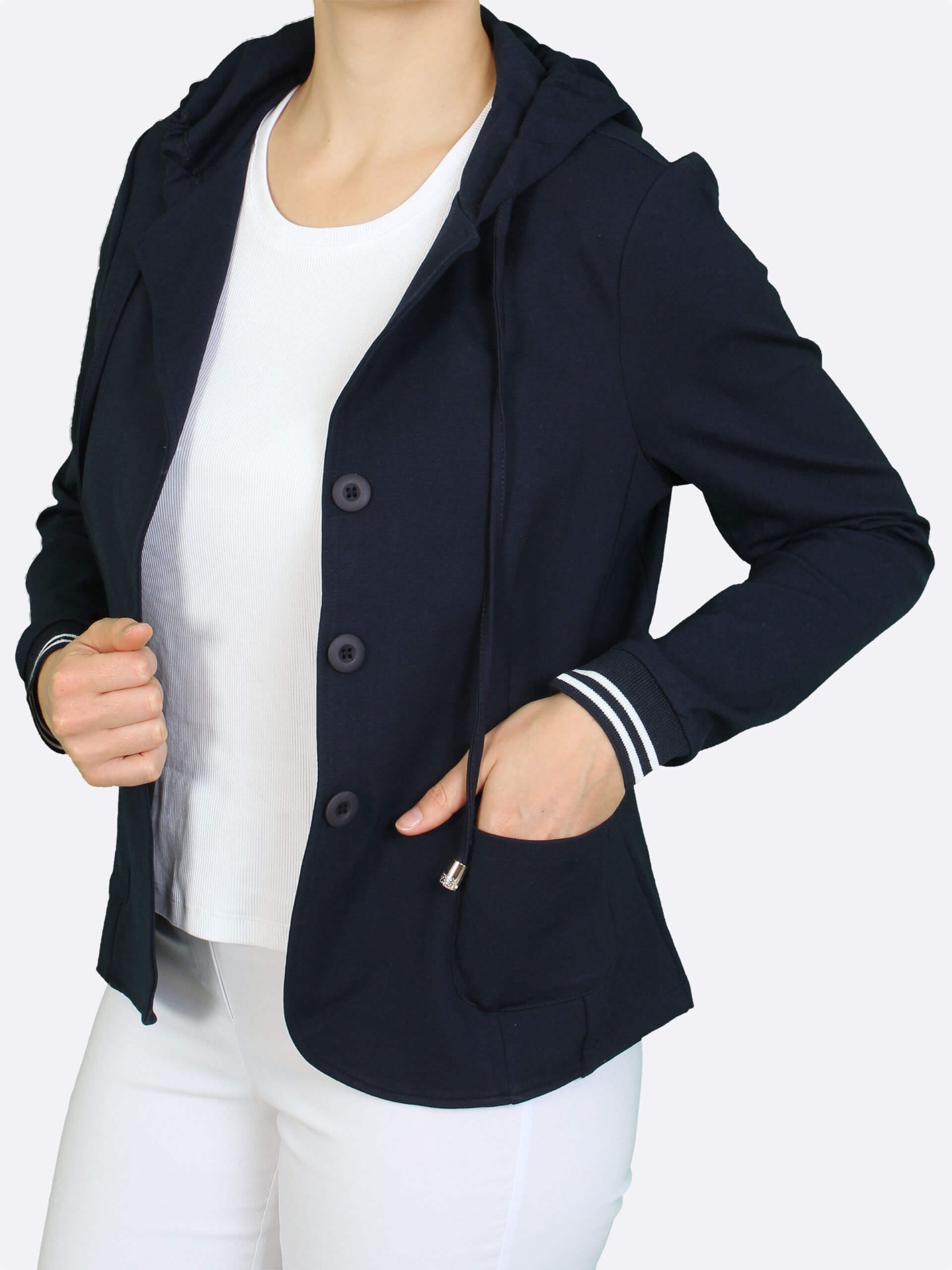 Stylové dámské sako z měkkého úpletu s jemným proužkem spojuje eleganci a maximální pohodlí. Kratší střih s kapucí dodává modelu moderní vzhled, zatímco zapínání na knoflíky podtrhuje jeho nadčasový charakter. Ideální volba pro každodenní nošení – do práce i na volný čas.