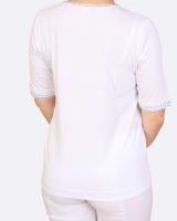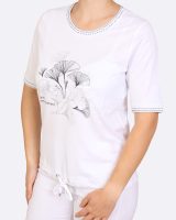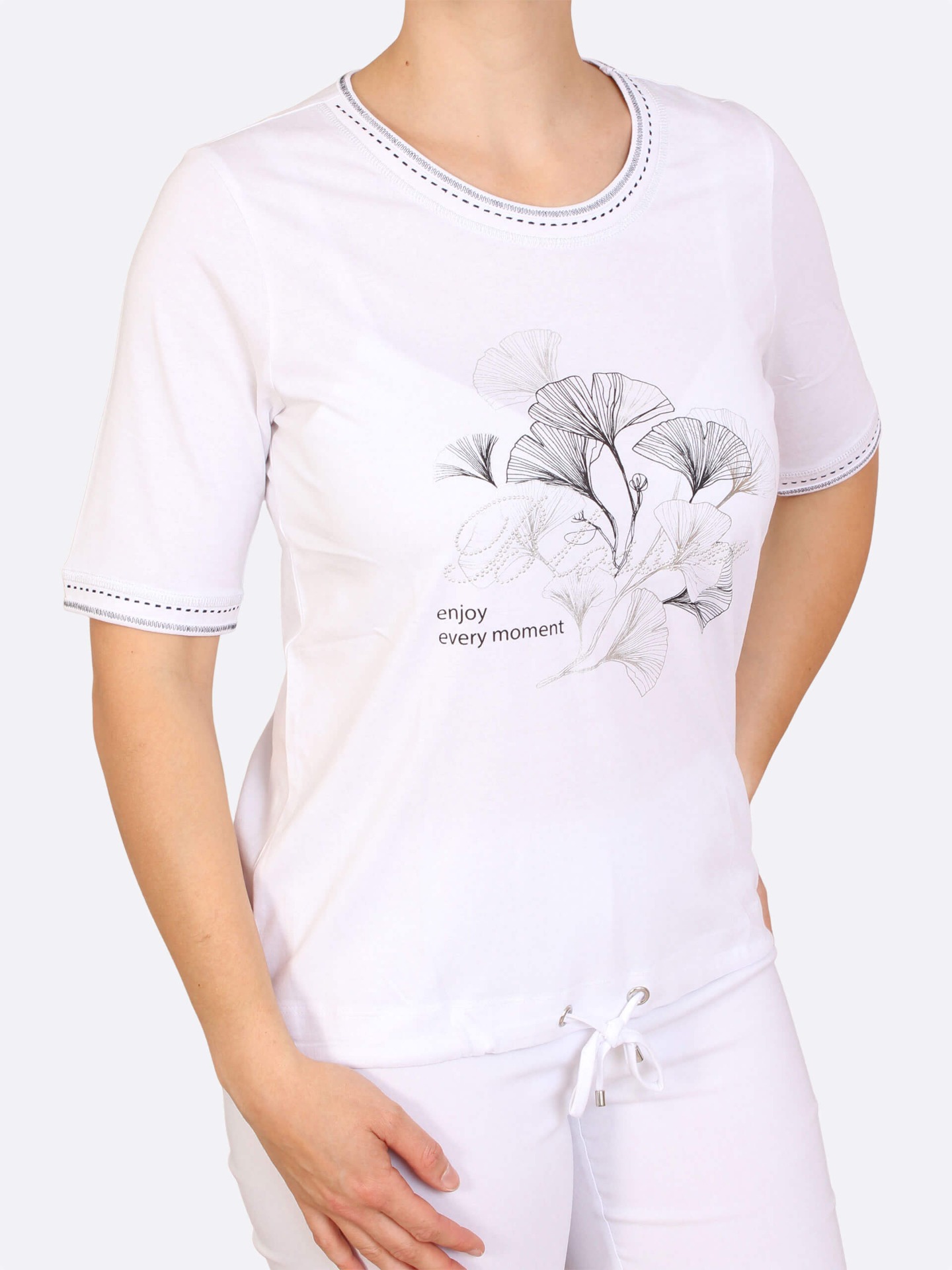 Bílé tričko s modalem a jemným potiskem ginkgo. Jemné ozdobné proužky na výstřihu a rukávech a stahovací šňůrka na lemu doplňují design.