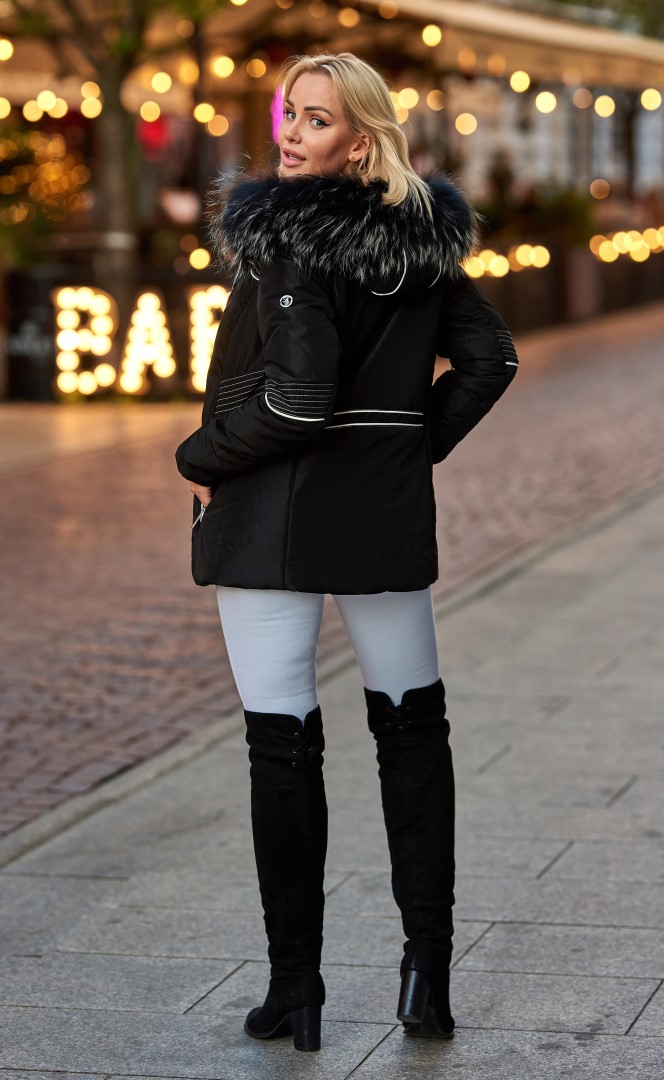 Luxusní dámská zimní bunda zdobená přírodním kožešinovým lemem z mývalovce na kapuci, která lze odepnout. Zapíná se na zip, kapsy jsou také zipové. Je zdobena kontrastním bílým lemováním a prošitím bílou nití. Bunda je zateplena vatelínem. Má sportovnější charakter a její střih zajišťuje pohodlí při nošení. Zadní délka bundy je cca 68 cm.
